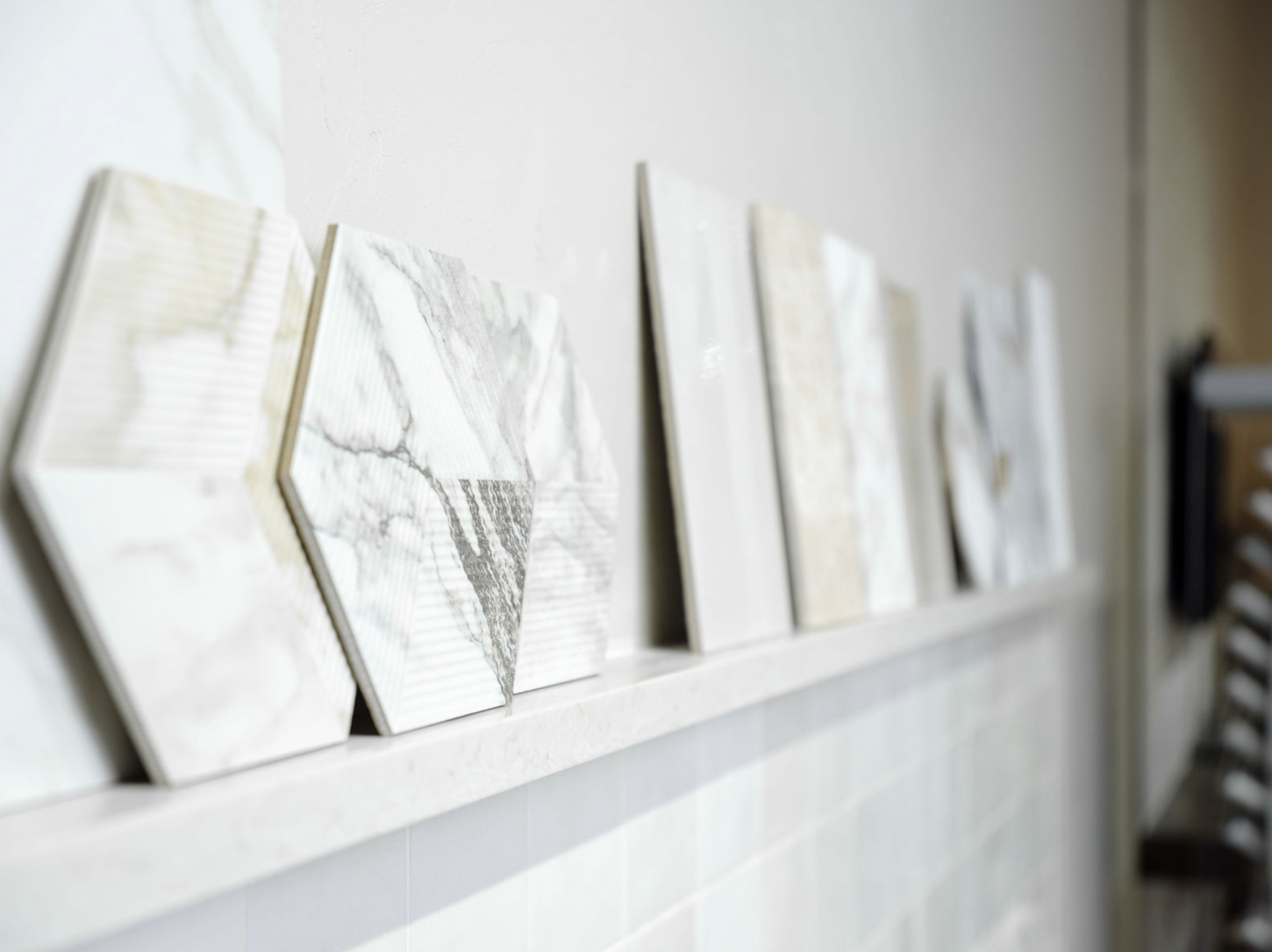 A row of decorative tile samples, featuring various marble-like patterns and textures, is neatly displayed on a shelf against a light-colored wall.